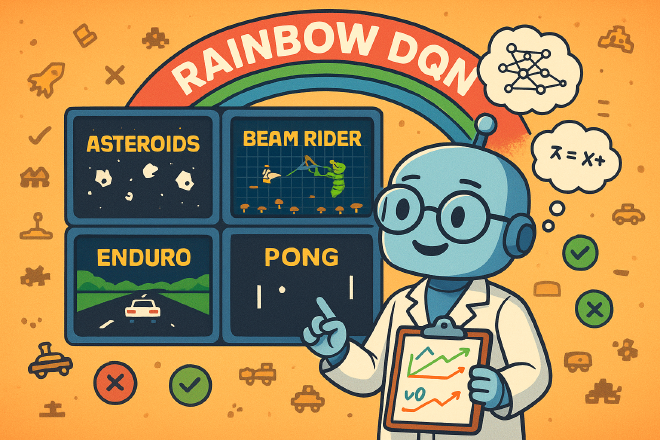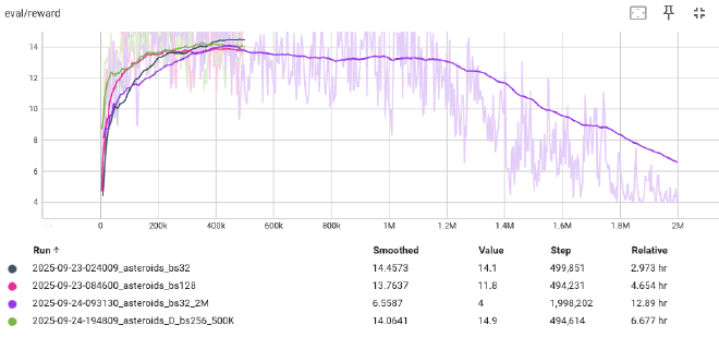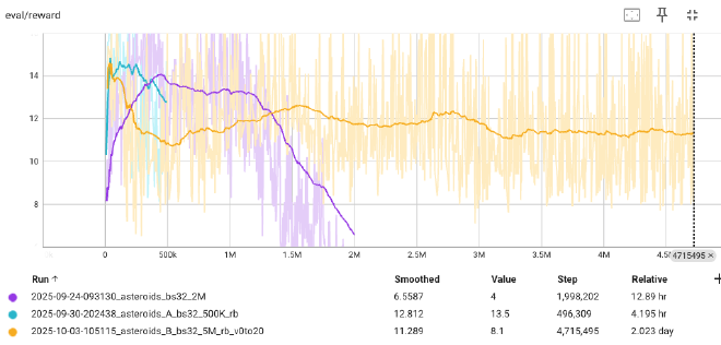 在「Asteroid-AI 專案:實驗歷程」文中我回顧了在 Py-Asteroids 小遊戲上訓練 Agent 的實驗發展歷程,這篇文章補充紀錄其中略過的 Rainbow DQN Atari 實驗結果。