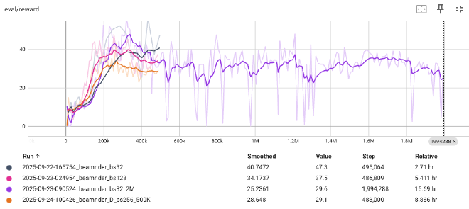 Beam Rider 遊戲是這批實驗中唯一 v2.0 表現比 v1.0 差的,也許跟隨機探索有剛好沒有找到比較好的策略有關?