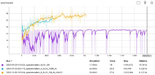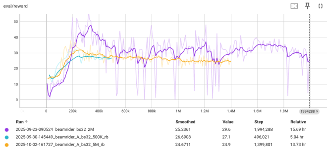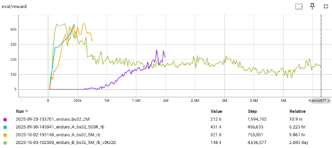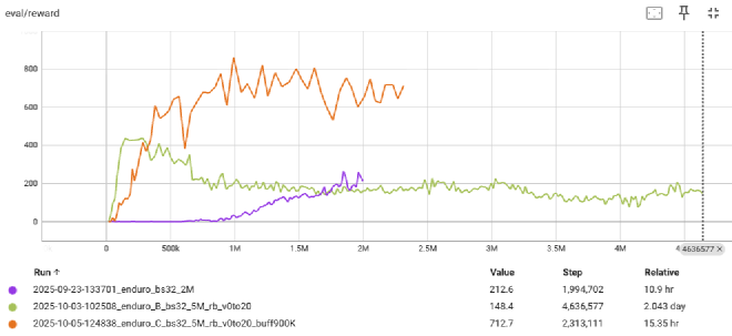 如同我在「Asteroid-AI 專案:實驗歷程」前文中紀錄:最後「加大經驗回放區間大小到接近 1M」的 Enduro 及 Py-Asteroids 實驗中,都觀察到最佳表現的進一步提升。參考下圖比較 v1.0(紫)、v2.0(綠)、和 v2.0 搭配加大後的經驗回放區(橘)在 Enduro 遊戲上的實驗結果,可以看到橘色線在最佳得分上的突破。