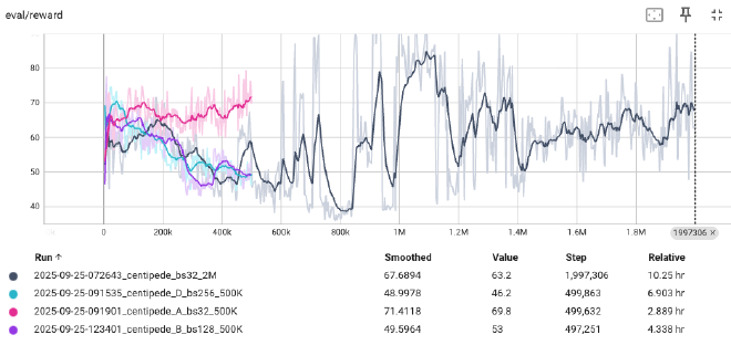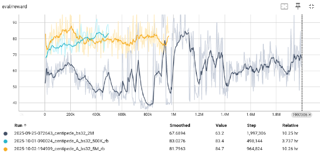 Centipede 遊戲的 v2.0 結果其實在效率、最高分、穩定度三個指標上看起來都有改善,但因為 v1.0 在訓練過程中也曾短暫達到過差不多高的分數,所以我還是保守一點把最佳表現視為持平或不確定。