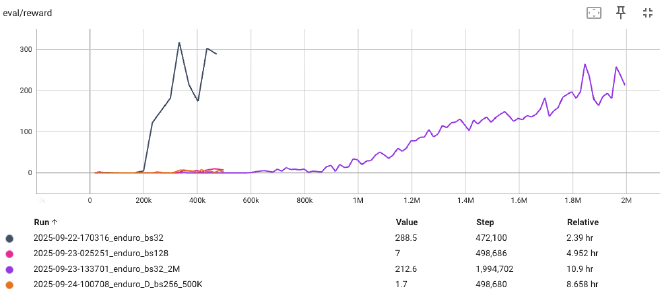 Enduro 是個賽車遊戲,超過一台車得一分,所以他的分數範圍看起來特別高。由 v1.0 的結果來看有時候似乎運氣好比較快開竅,有時候則會探索一段很長的時間都沒有長進。v2.0 的訓練則都能在初期成功,某種程度上也能視為訓練穩定度的改善。