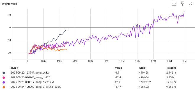 我在 v2.0 的圖上皆保留了一條 v1.0 裡的訓練結果方便直接對照比較(結尾為 _2M 的 case)。為節省資源,我有時會提早結束表現看起來不太會再上升的實驗,因此有些線條看起來比較短。