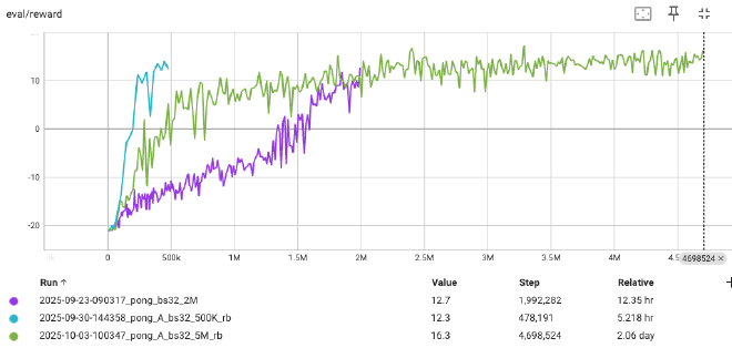 還是必須補充說明的是:以上的觀察和比較是基於經驗回放(Experience Replay Buffer)大小 = 1e5 條件下的實驗結果,低於文獻中一般採用的 1M(1e6)。