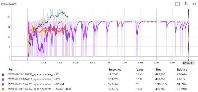 雖然結果看起來相當正面,但我當時其實是蠻失望的,因為在這三個指標中我最在意的「模型最佳表現」僅在 Enduro 和 Space Invaders 上有明確的提升。