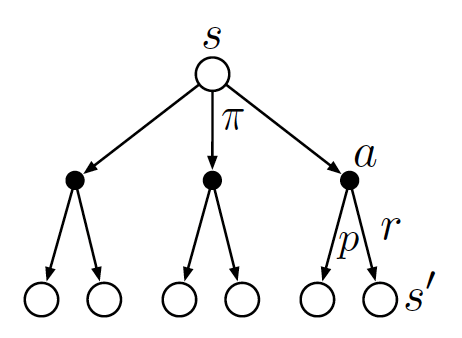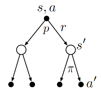 每個實際狀態 \(s\) 之下可能接續著不同的狀態–行動狀態節點 \((s,a), (s,b)...\);而每個實際狀態–行動節點 \((s,a)\) 之後則可能進入不同的新狀態 \(s^\prime, s^{\prime\prime},...\)。